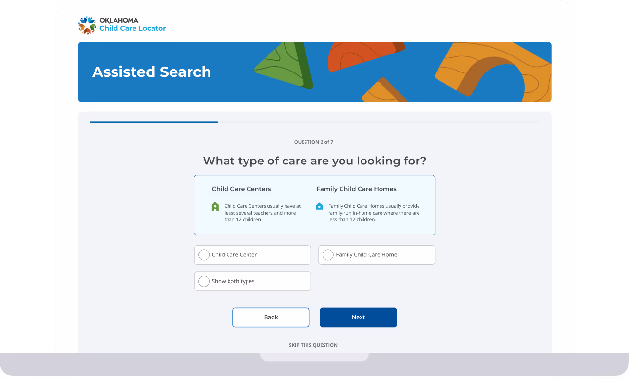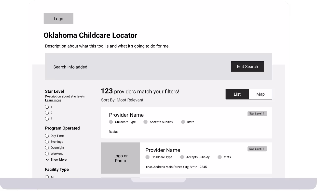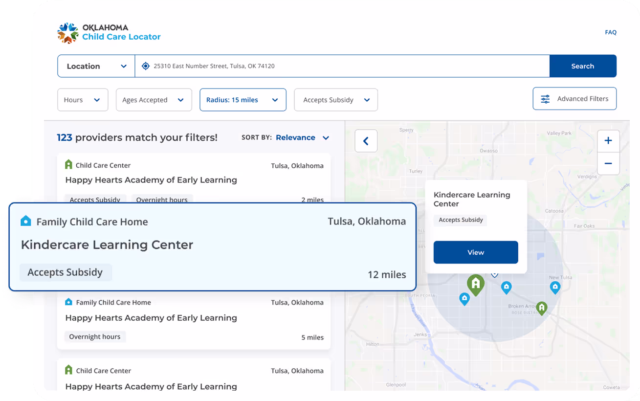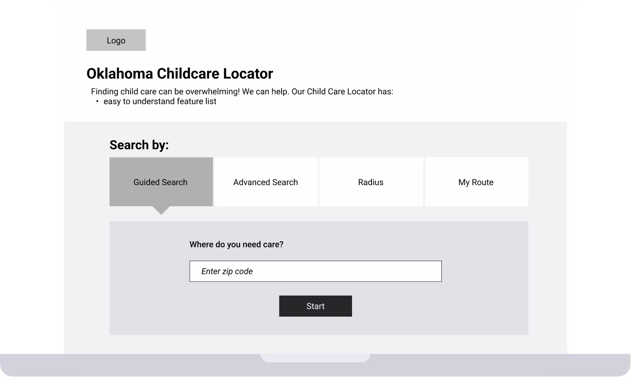 The Oklahoma State Government approached Gitwit to create a user-friendly Childcare Locator web application to help parents find licensed childcare providers across the state. As a parent myself, I wanted to enhance the process by offering multiple search options: 1) Guided Search, which leads users through a set of questions, 2) Advanced Search for specific criteria, 3) Radius Search to find providers within a certain distance, and 4) My Route Search, which searches for providers along a route between two points.