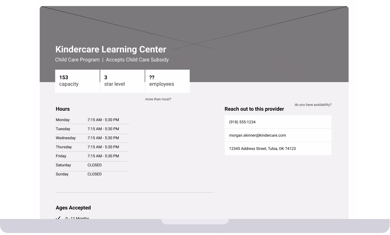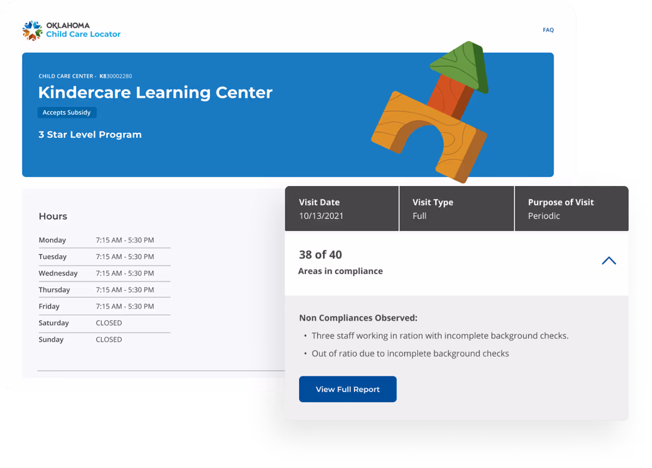 Keeping within the brand language of the Oklahoma state branding, I tried to keep this feeling familiar yet modern. Because this is a heavy research phase for parents, I also tried to keep the interface simple and organized, not using any ux patterns that are unexpected for this type of searching. Finally, I created these building block illustrations as a nod to children’s play blocks, but also to bring some visuals alongside the clean UI.