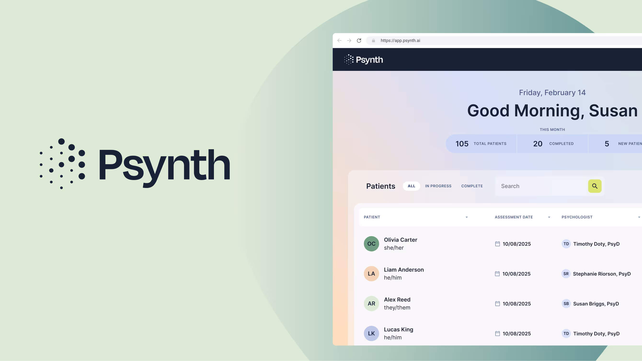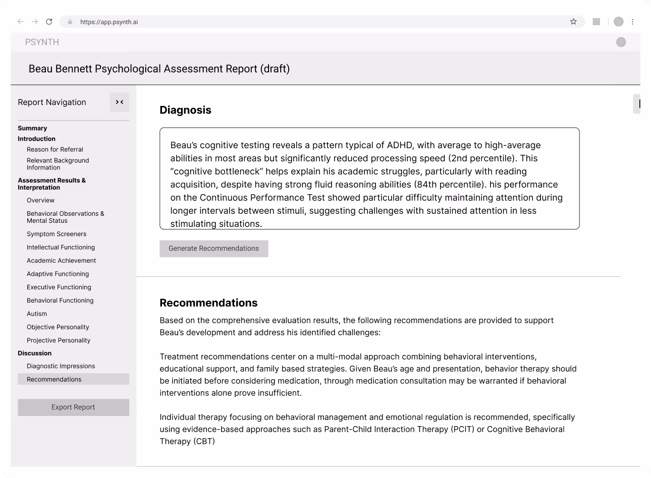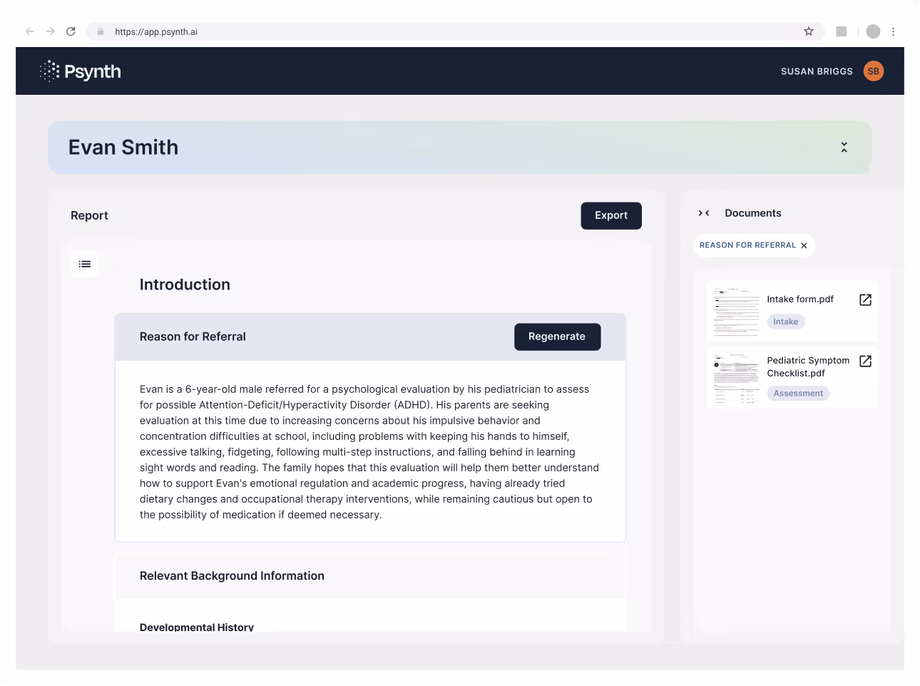 Psynth is an AI-powered psychological assessment platform that automates clinical report generation by synthesizing information from multiple intake and assessment documents. Psychologists upload patient files, the system intelligently labels content by report section, and generates comprehensive clinical reports. This reduces a process that once took days to just minutes while minimizing human error.