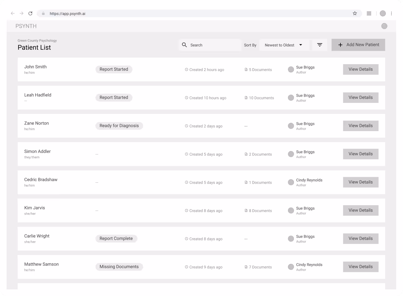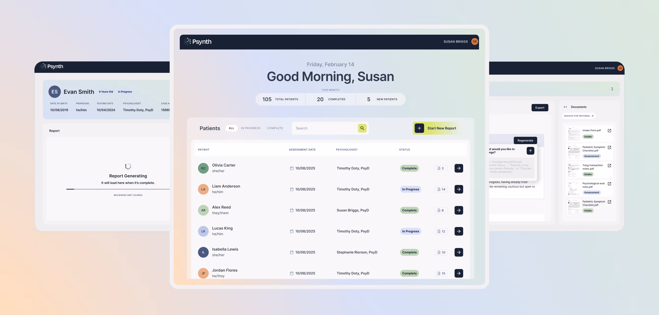 Our goal was to design a system that automated synthesis without sacrificing clinical oversight: creating a clear, efficient workflow from patient creation to final report, while making it transparent which source documents informed each section so psychologists could easily verify accuracy.