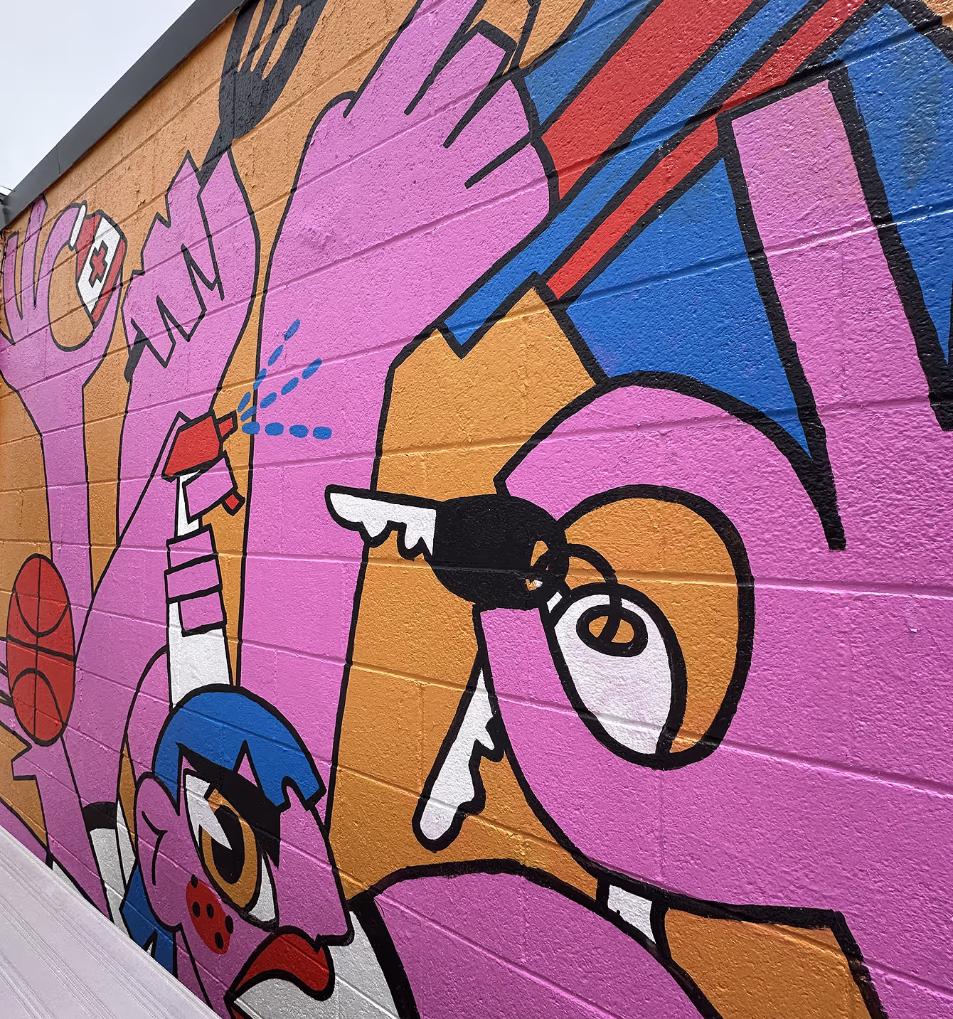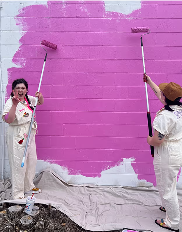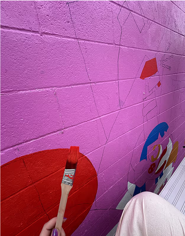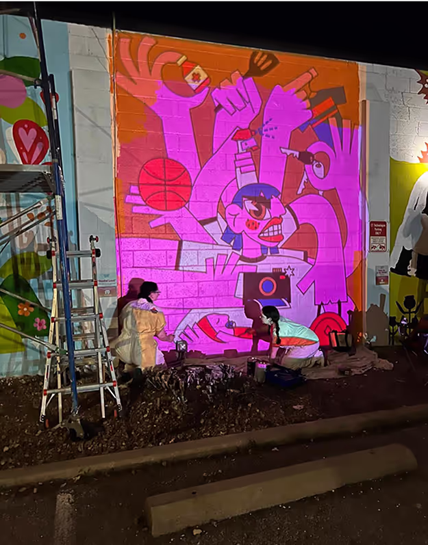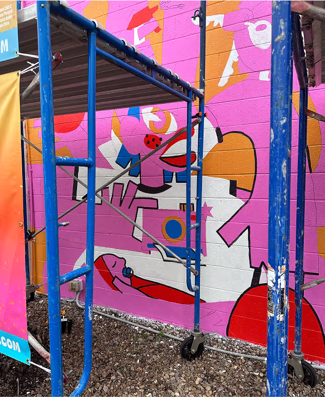 No matter how much you’ve planned, there’s nothing more daunting than starting from a blank white wall (or sketch page, or figma frame, you get the idea). Luckily, with the help of researching and advice from our professional mural friends, we had at least an idea of how to get started. We covered the entire wall with our main color then traced the outline in pencil to give us a guideline for filling in the remaining colors. With this being our first mural, I kept the design very simple and color blocked to be visually bold but technically easy to execute. Besides not knowing how to move scaffolding in a rock bed and our projector dying 4 times while tracing at night, we managed to successfully bring the mural to life.